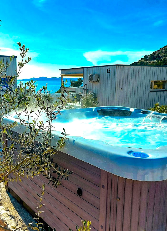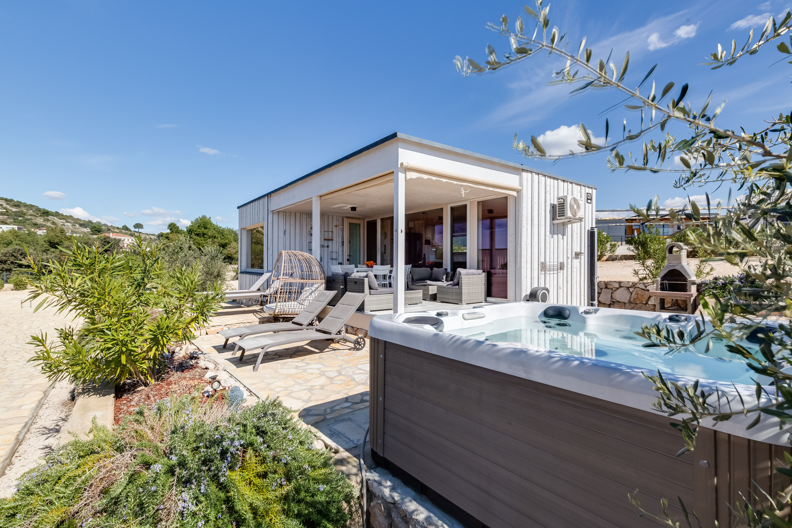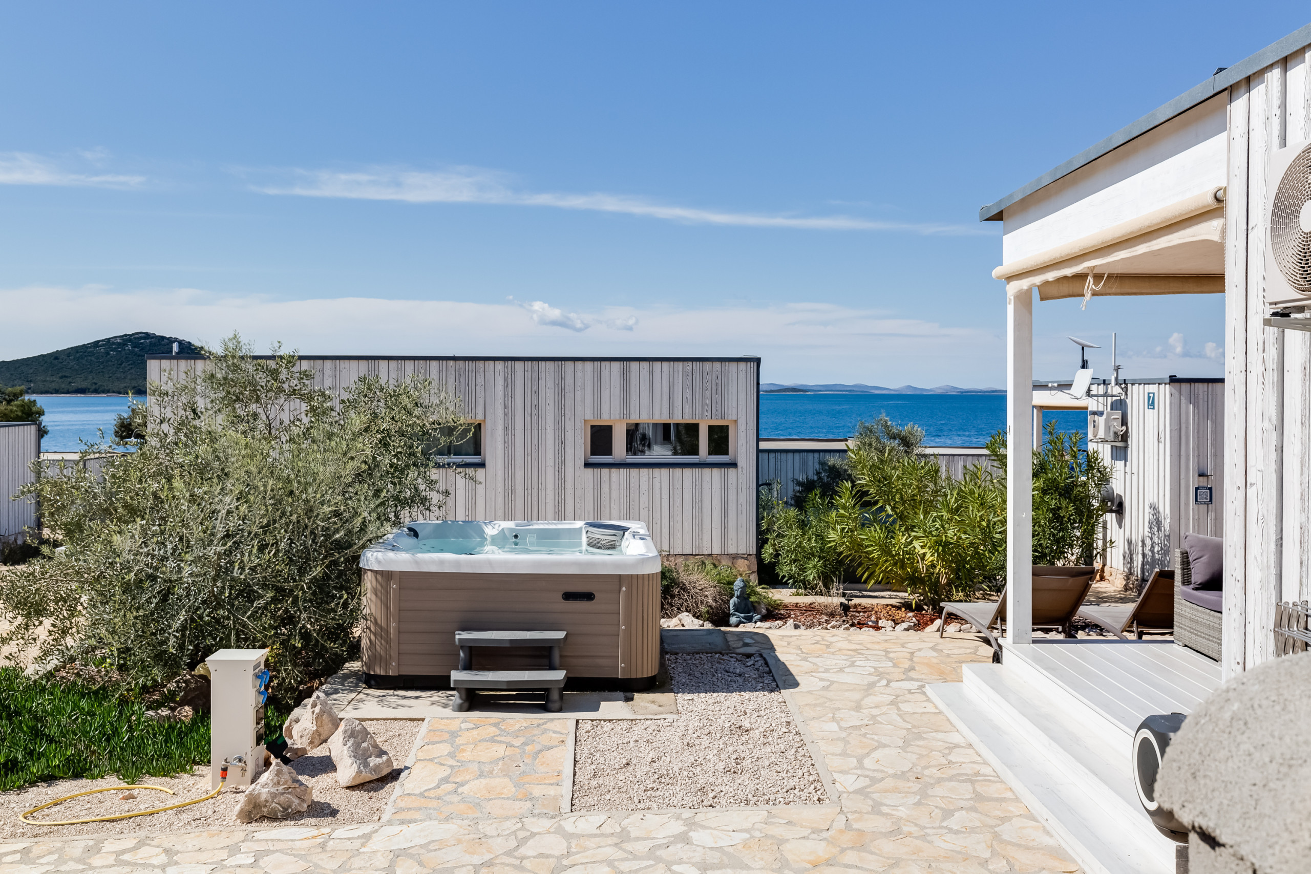 The outdoor area invites you to relax: A private, heated jacuzzi (1.5m x 1.5m), a terrace, a garden and a barbecue area offer numerous opportunities for shared moments. From here, you can enjoy dreamlike views of the sea, the jacuzzi and the garden.